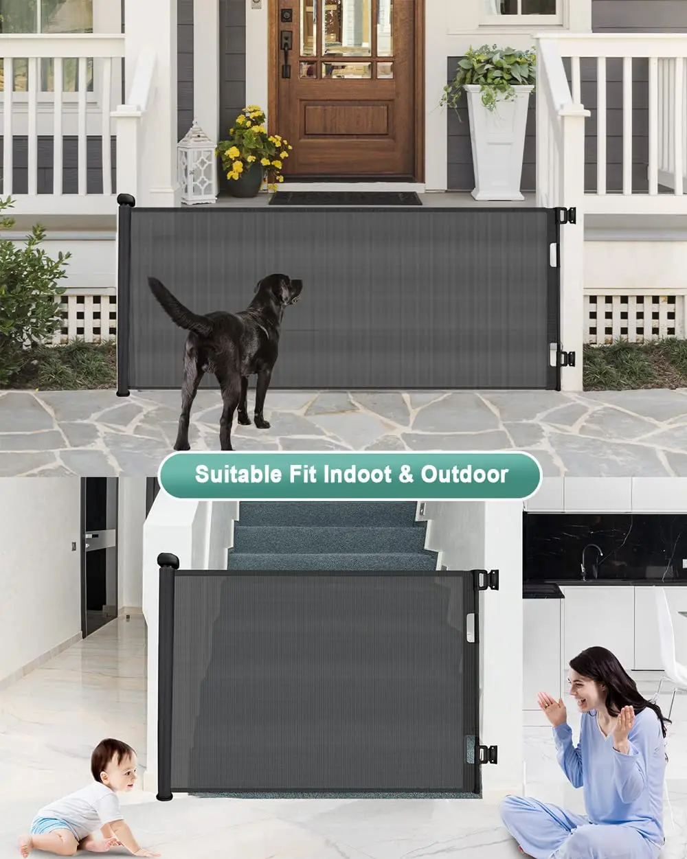 [One Gate for Many Purposes] - Retractable Baby Gates can be used both indoor and outdoor. Also if you have small babies or pets in the home, this is an excellent protective and blocking retractable gate indoor. Protect babies from crawling into dangerous areas and prevent pets from entering places where they are not allowed to go. After pressing the hidden lock, the push and pull force is tight and it will not be easily pulled apart. Be gentle and protective of your family.
