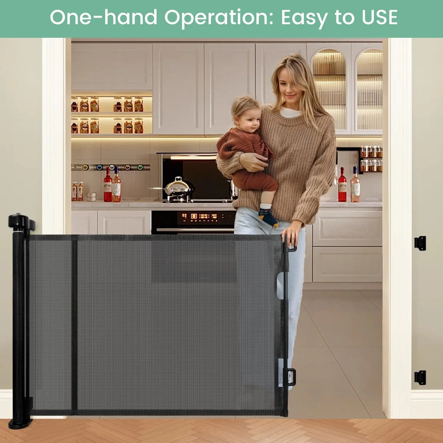 [Provide Children and Pets Protection] - Baby Gate Stairs designed by the strong and soft mesh to prevent our baby from any pinch or jam and all parts are non-toxic no smell. Perfect for 6~24 months baby and puppy and small dog. Retractable Mesh Gate keep baby away from danger, providing a safe environment to play. The one handed operation design can allow you to open and close the gate while holding your child.